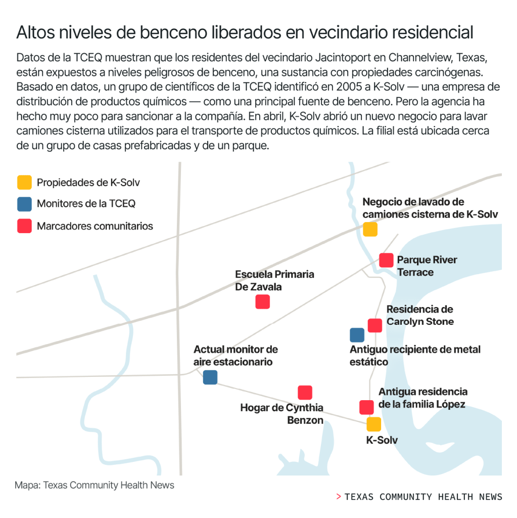 La Comisión de Calidad Ambiental de Texas — Texas Commission on Environmental Quality o TCEQ por sus siglas en inglés — no le ha informado a los residentes sobre los riesgos de salud que enfrentan; y ha hecho muy poco para frenar a la compañía responsable, a pesar de saber que desde sus instalaciones K-Solve, una compañía dedicada a la distribuición de químicos ubicada en el vecindario Jacintoport de Channelview, por años ha liberado grandes cantidades de benceno al aire. En cambio, la agencia estatal, con base en Austin, le ha permitido a la empresa ampliar sus operaciones en cuatro ocasiones desde que detectó el problema en el 2005. Actualmente, K-Solv puede emitir legalmente casi 20 veces más la cantidad de compuestos orgánicos volátiles que emitían en ese entonces. El benceno es uno de los elementos de ese compuesto tóxico.