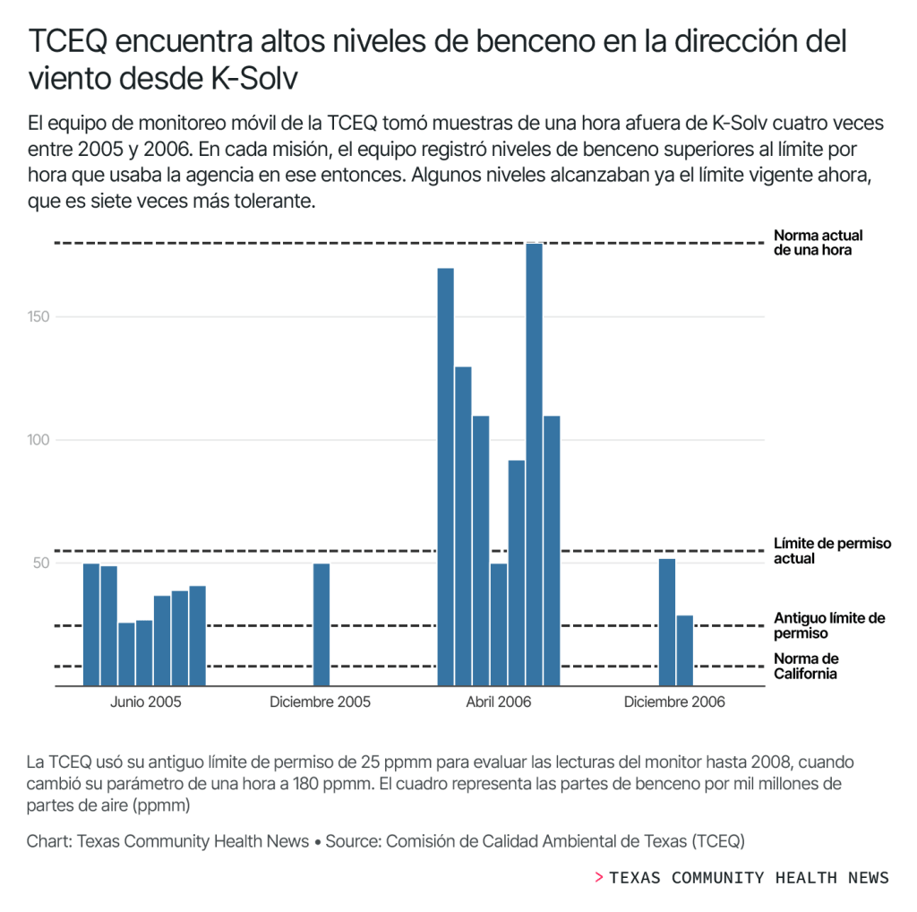 Un funcionario de la TCEQ que revisó el permiso dijo en un memorando interno que las proyecciones eran que K-Solv excedería el límite por hora de benceno — cambiado de 53 ppmm a 54 ppmm — unas 54 horas al año. Pero añadió que como esa predicción era en el “peor de los casos”, la agencia no “anticipaba que se dieran efectos adversos en la salud del público”.