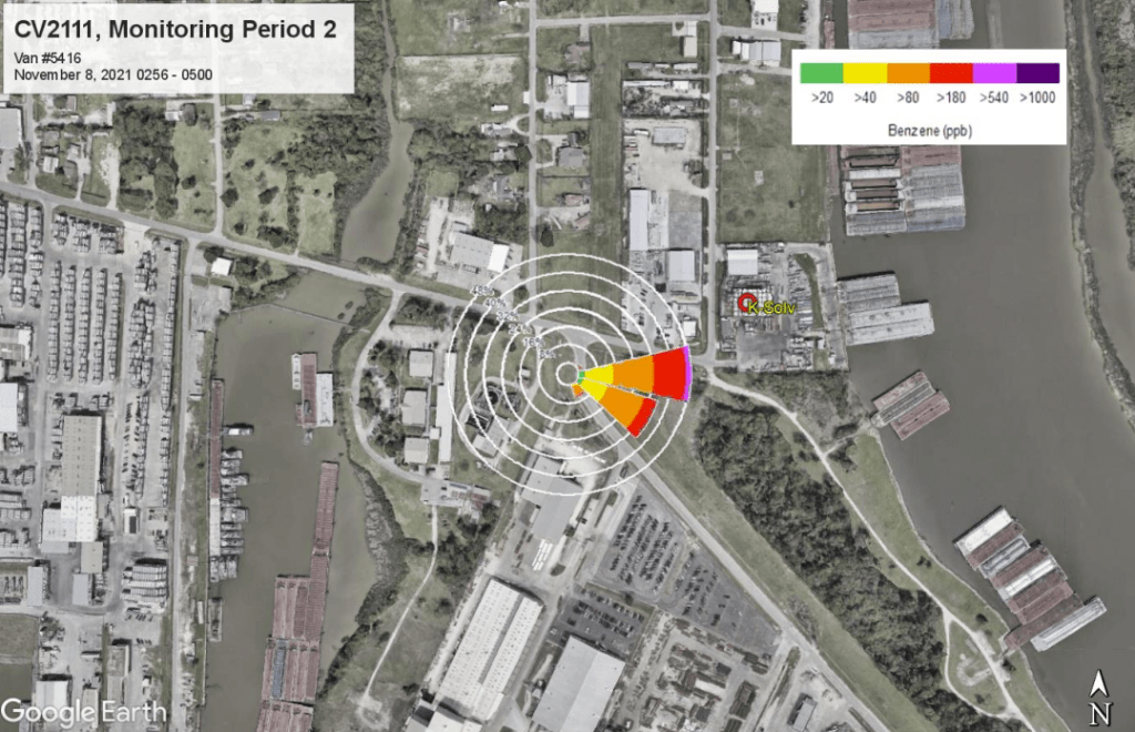 En la visita de octubre de 2021, los científicos recopilaron datos en las afueras de K-Solv y otras instalaciones, incluida una de las refinerías más grandes del país. El promedio de 36.2 ppmm en 40 minutos tomado fuera de K-Solv fue el más alto del día. El segundo promedio más elevado, tomado en una muestra de 20 minutos en carreteras industriales al sur de Channelview, fue de solo 3.4 ppmm.
