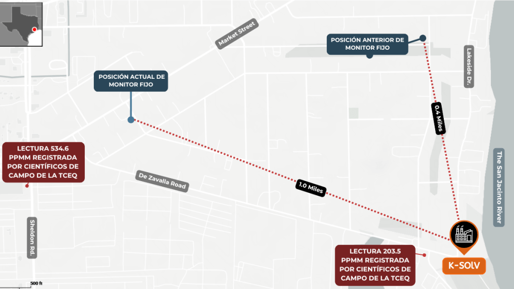 La TCEQ también movió el monitor estático más lejos de K-Solv, y ya no está en la dirección del viento desde la empresa. La agencia dijo que eligió la nueva ubicación para poder instalar un monitor más sofisticado que era demasiado grande para el antiguo sitio.