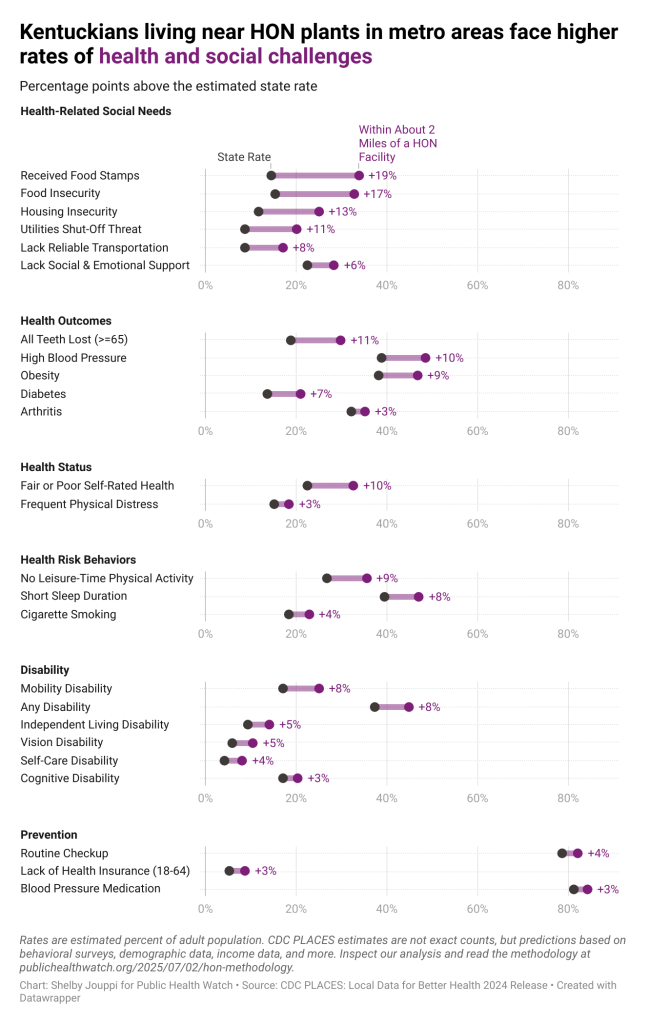 - When compared to the estimated national rates, residents of metropolitan areas who live near HON plants are more likely to identify as having “fair” or “poor” health status and a disability, according to the CDC. They are also more likely to lack stable housing and reliable transportation, and feel socially isolated.