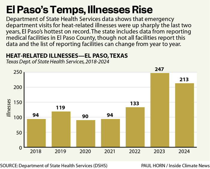 The city of El Paso said it does not track heat-related illnesses. The city referred Inside Climate News to El Paso’s nonprofit health information exchange, PHIX, for that data. However, PHIX declined Inside Climate News’ request to access the data because the organization is set up to fulfill requests from health care professionals and academic researchers.
