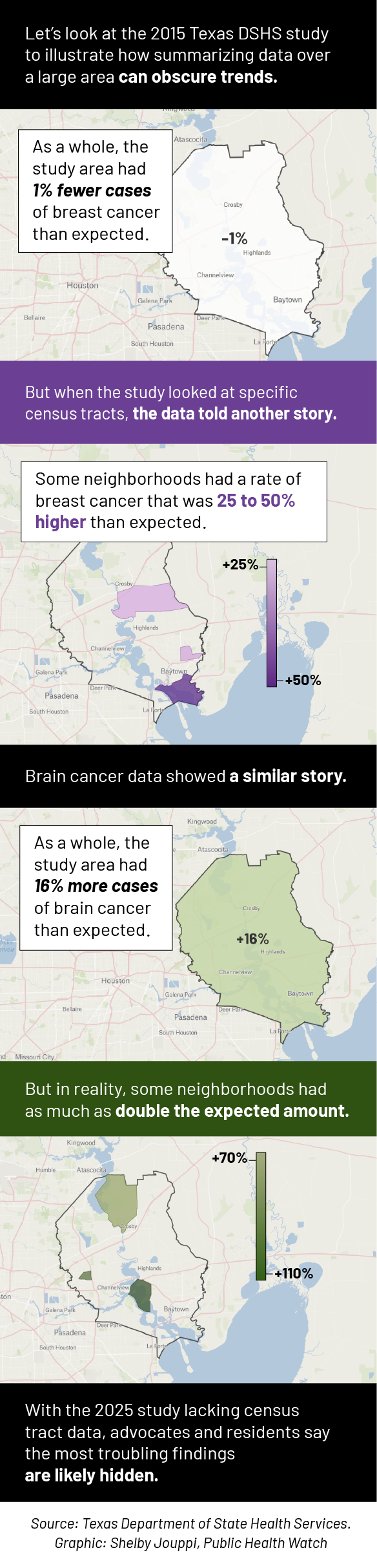 One difference stood out: Unlike the 2015 investigation, the 2025 study did not provide any census-tract level information. Patel, the DSHS epidemiologist, said that choice stemmed from a combination of privacy protections and statistical rigor. A DSHS spokesperson said the agency’s scientists didn’t even look at cancer cases by individual tracts.