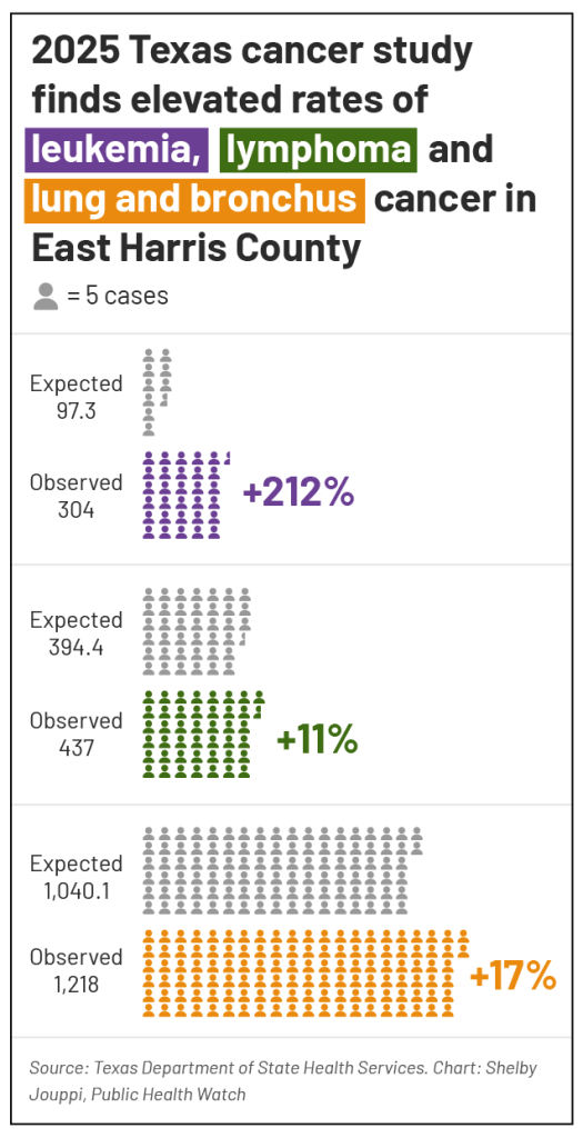 The new investigation examined 22 types of all-age cancers and three childhood cancers. It found that rates of leukemia in the study area were triple the Texas average. Rates of cervical cancer were 18% above the state average. Rates of lung and bronchus cancer were 17% above the state average. And rates of lymphoma were 10% above the state average.