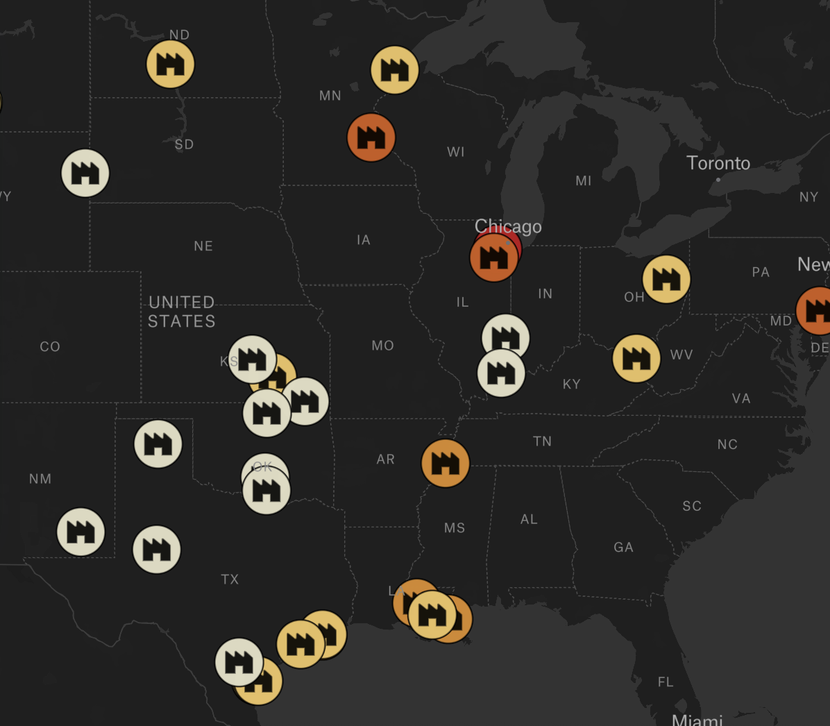 The map includes EPA datasets accessed using the Toxic Industries Database, developed by Maine-based Material Research L3C, as well as industry-reported worst-case release scenario data collected by the Natural Resources Defense Council, which petitioned the EPA to ban hydrogen fluoride at refineries in January 2025.